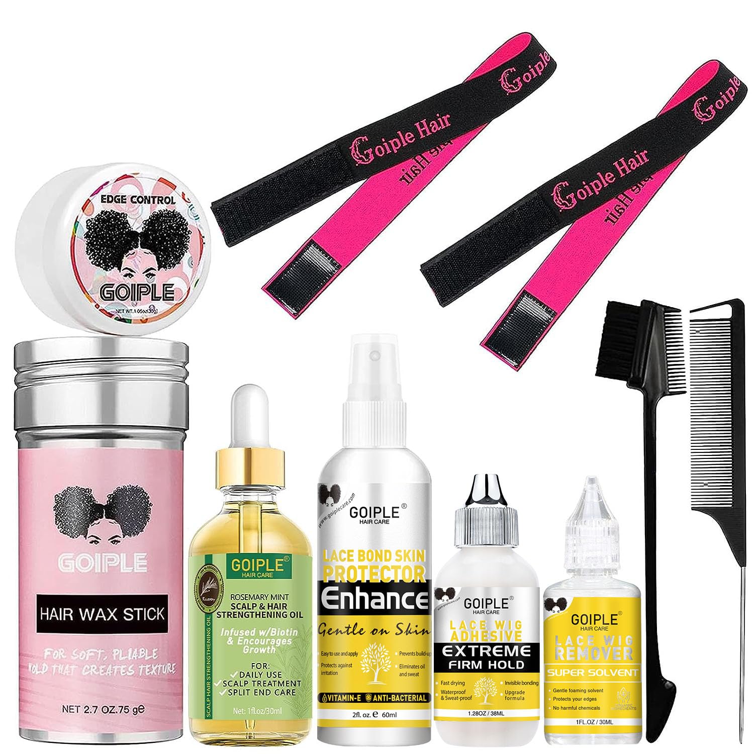 The package includes:1pc 1 fl.oz rosemary hair growth oil+1pc edge brush+1pc rat tail brush+1pc wig glue+1pc wig glue remover+1pc 2.7oz hair wax stick+1pc 1.05oz edge control+1pc 2fl.oz skin protector spray+2pcs elastic bands for wig .This hair care and styling kit will make it easier to get the perfect look!